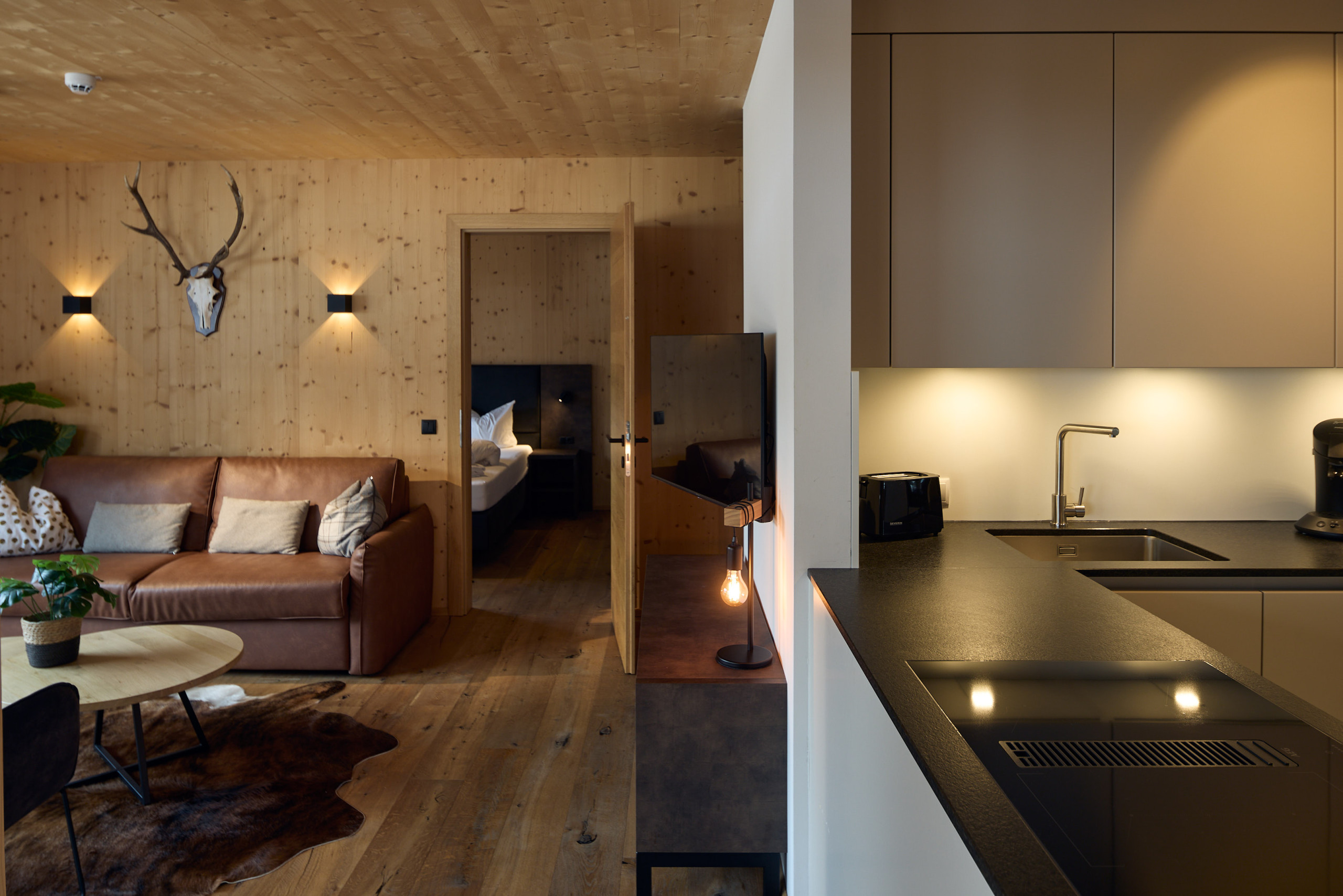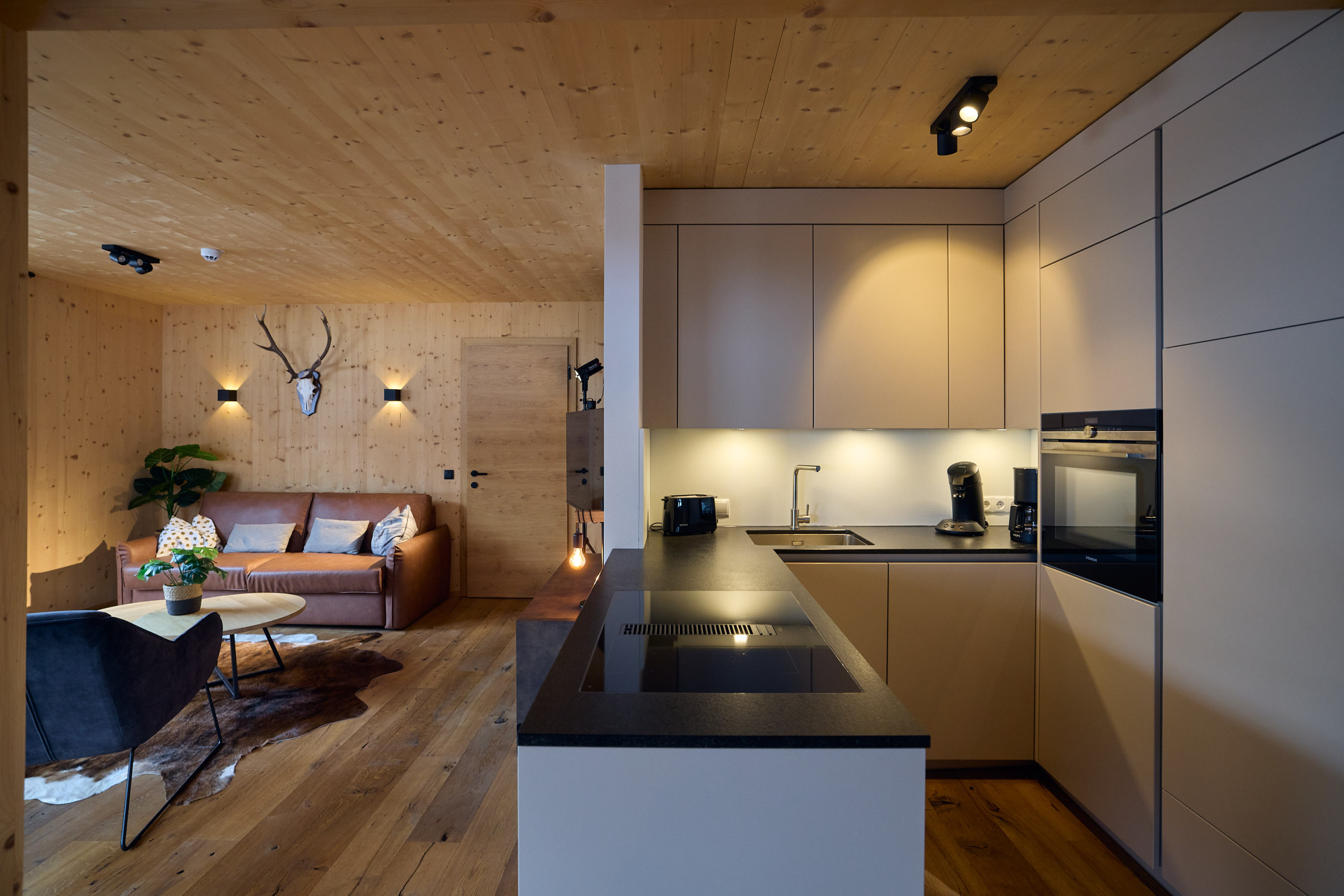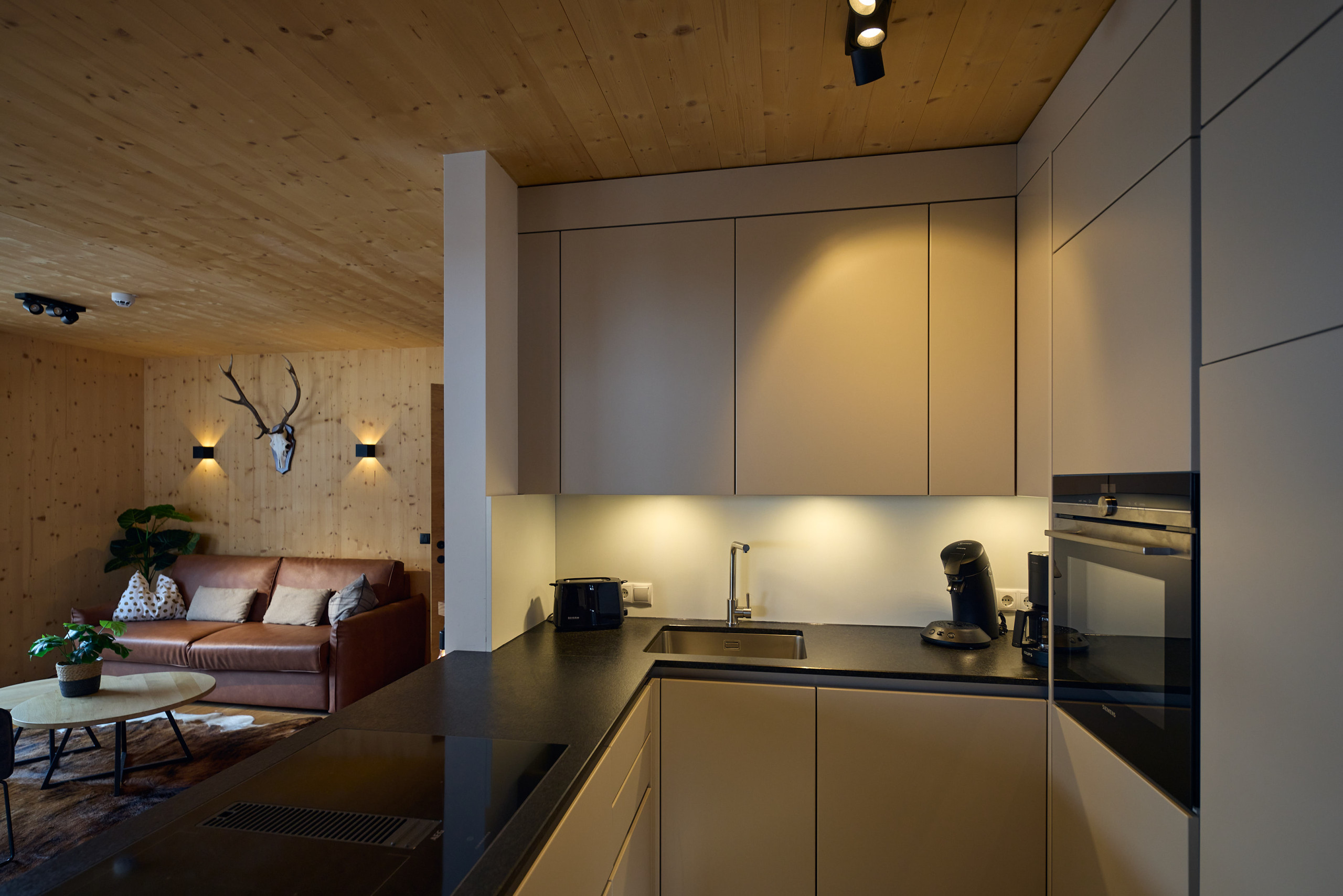 De volledig uitgeruste keuken laat niets te wensen over. Met een inductiekookplaat, koelkast, vriezer, vaatwasser, magnetron en koffiezetapparaat (Nespresso-capsule en Senseo-pad) is alles aanwezig wat het hart van de zelfvoorzieningsgast begeert. Een sat-tv met programma's in het Duits zorgt voor entertainment.