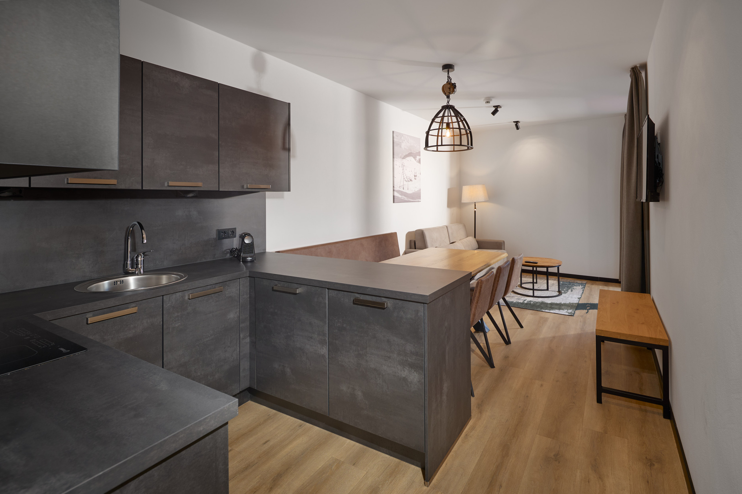 De moderne gemeubileerde vakantiewoning heeft twee gezellige slaapkamers met in totaal drie bedden - waaronder twee tweepersoonsbedden en een extra slaapbank in de gemeenschappelijke ruimte. Twee doucheruimtes zorgen voor voldoende comfort. De volledig uitgeruste keuken laat niets te wensen over: hier vindt u een koelkast, vriezer, vaatwasser, Senseo Pad koffiezetapparaat en nog veel meer.