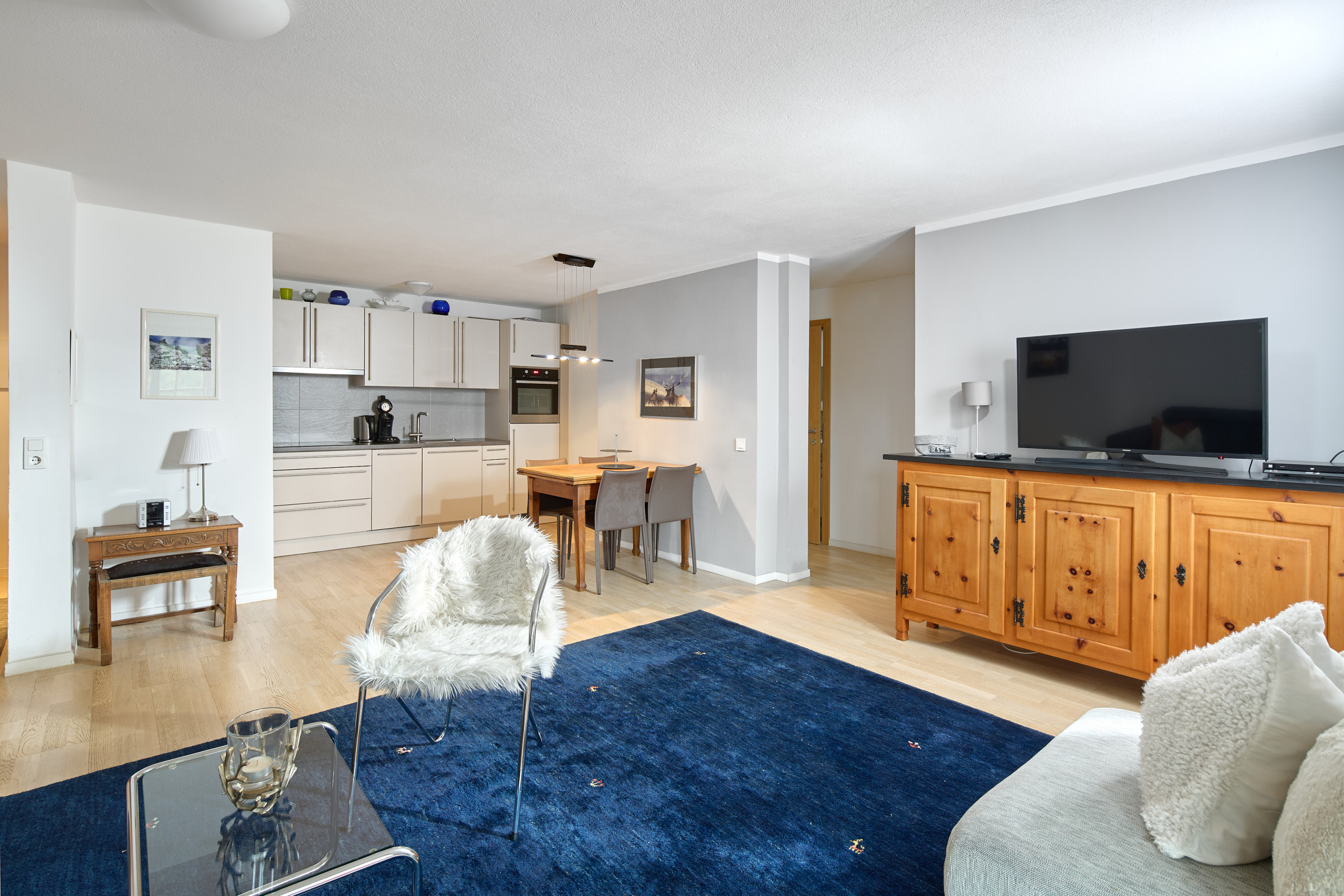 The fully equipped American kitchen invites you to cook together. It has all the necessary appliances such as a refrigerator, freezer, coffee machine, oven, dishwasher and toaster. The television with German channels and multiple languages ensures cosy evenings.