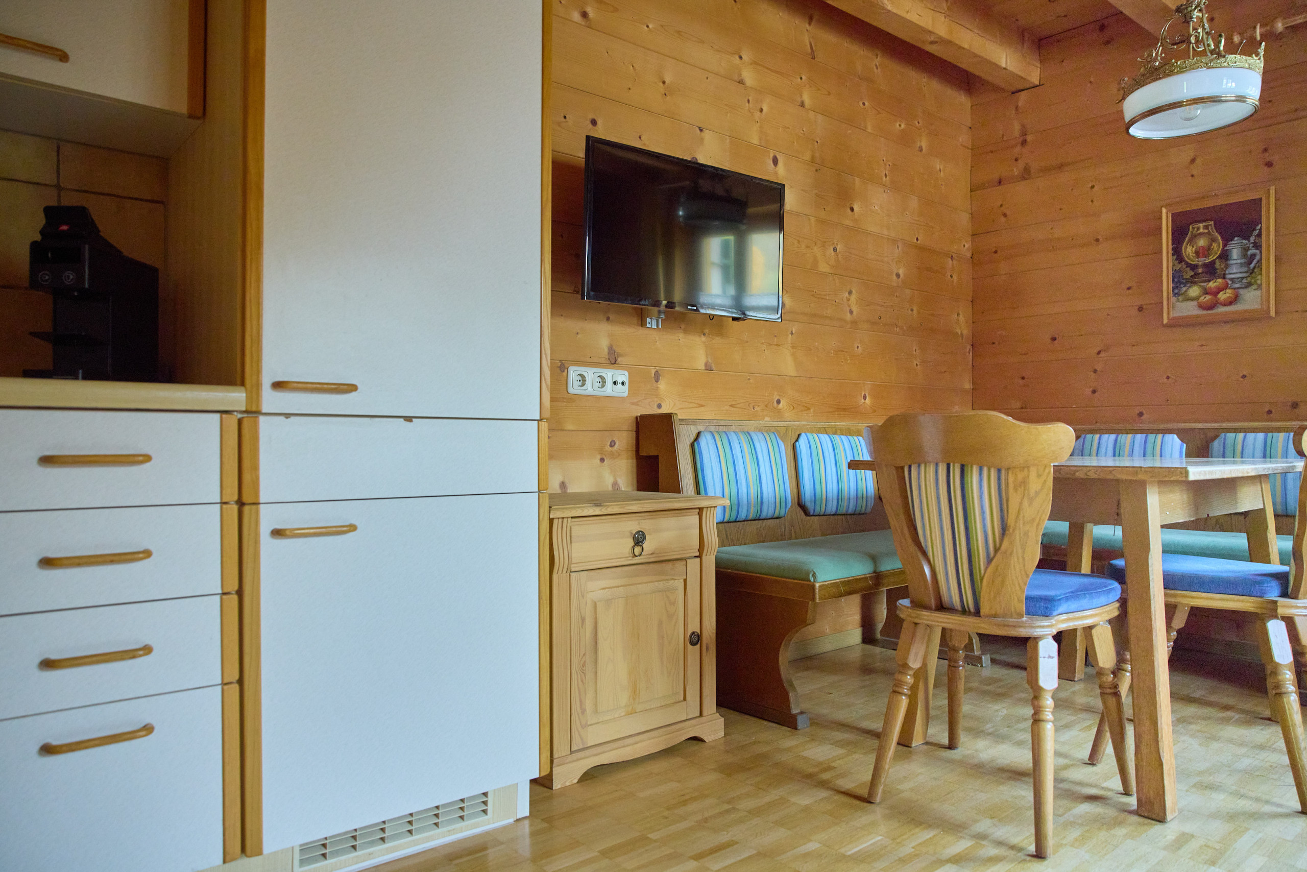 Die voll ausgestattete amerikanische Küche lässt keine Wünsche offen. Mit Kühlschrank, Geschirrspüler, Kaffeemaschine, Ofen und komplettem Küchenequipment kannst du problemlos deine Lieblingsgerichte zubereiten. Ein Satelliten-TV mit deutschen Sendern sorgt für Unterhaltung.